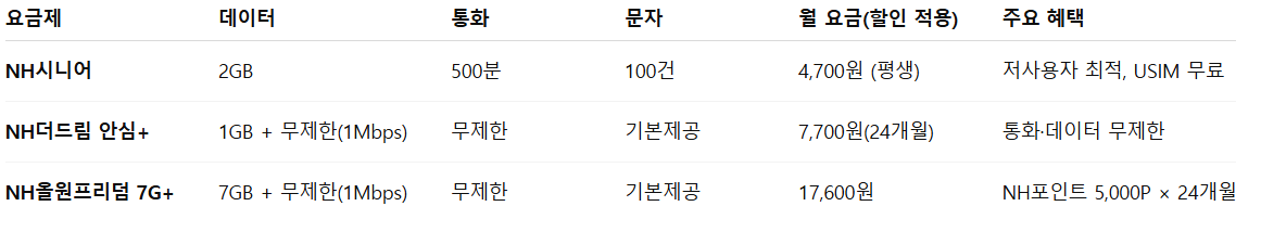 - NH더드림 안심+: 통화·데이터 무제한, 가성비 최고
