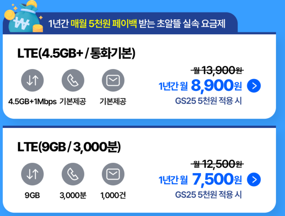 유모바일의 GS25 요금제는 기본요금 자체도 저렴하지만, 1년간 매달 5천 원 페이백 쿠폰으로 인해 실질적으로는 더 큰 절감 효과가 있습니다.