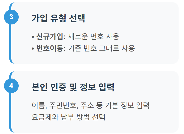 - 번호이동: 기존 번호 그대로 사용 (이 경우 기존 통신사 정보 필요)
