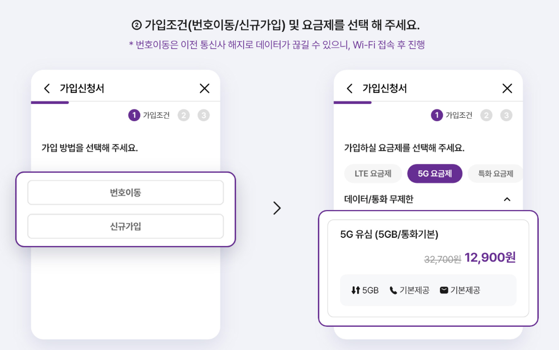 유심카드 번호 입력 > 가입 유형 선택 > 요금제 선택 등