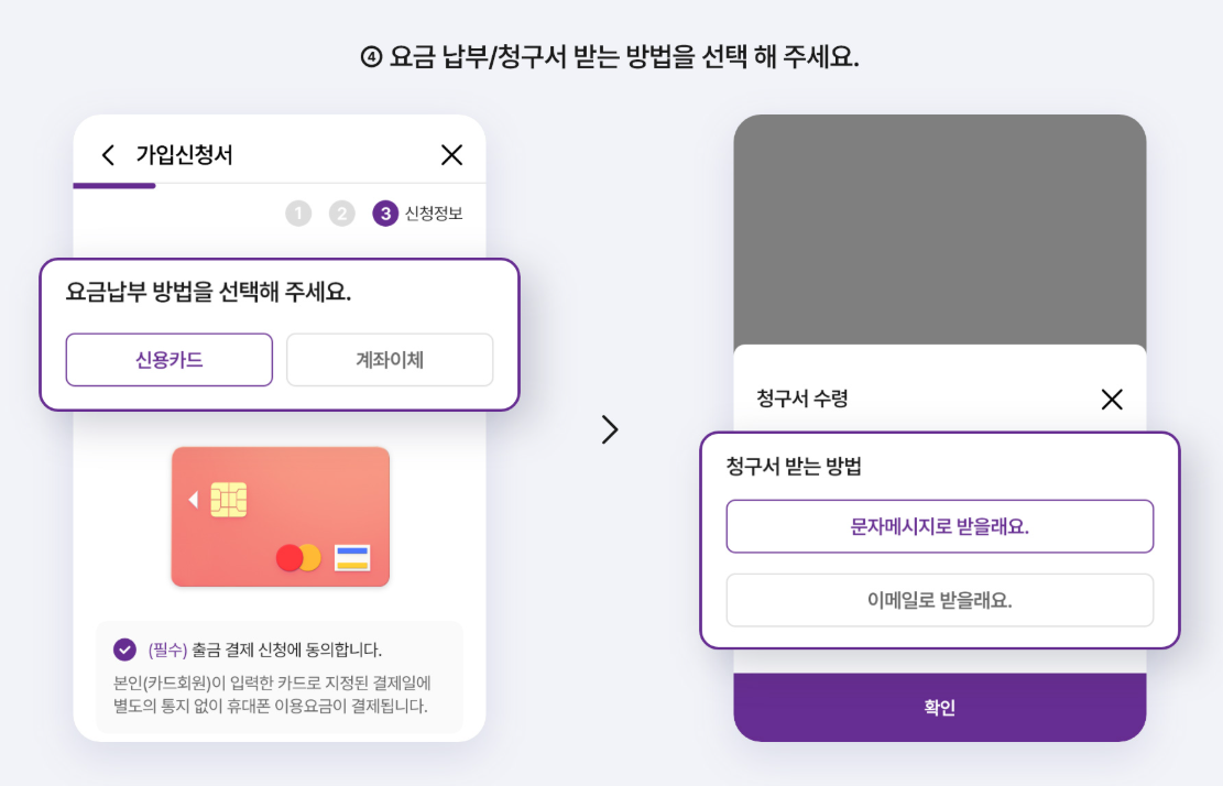 이름, 주민번호, 주소 등 기본 정보를 입력합니다. 요금제와 납부 방법(자동이체 또는 카드)도 이 단계에서 선택합니다.