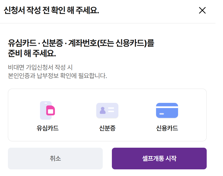 비대면 가입에 필요한 준비물을 준비하고 셀프개통 시작 버튼을 눌러 화면에서 안내하는 대로 필요한 정보를 입력합니다.